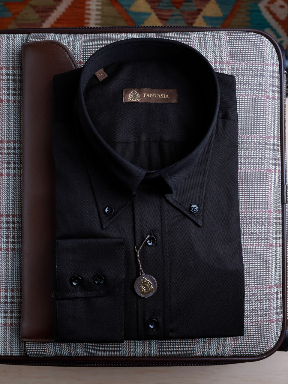 أضف لمسة من الفخامة والرقي إلى إطلالتك مع هذا القميص الأسود الكلاسيكي من فنتازيا المصمم خصيصًا للرجل العصري الذي يقدّر التفاصيل الدقيقة والخامات عالية الجودة.